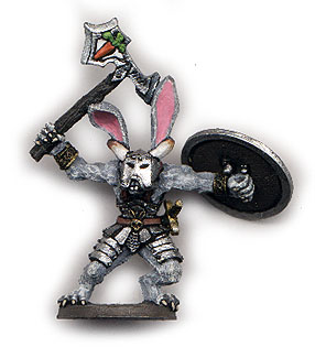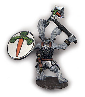 "You know of course this means war!" This is a Ral Partha personality - Doom Bunny. The carrot on the shield sold me straight away. I think they actually produced bunny troops for a while but I never saw them done here in Oz. |