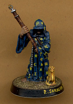 This wizard is actually the second wargame mini I ever painted. It's from the Ral Partha 3 stage character sets. It was the basic cleric. I painted this with enamels and as you can see it needs a lot more contrast to make the cloak really pop out. I also learnt it doesn't hurt to stick with one or two symbols when doing a pattern. On this guy I didn't want to repeat any of the symbols so in the end I was really running out of ideas. I added the little dragon familiar a few later, from the Ral Partha familiars set. |