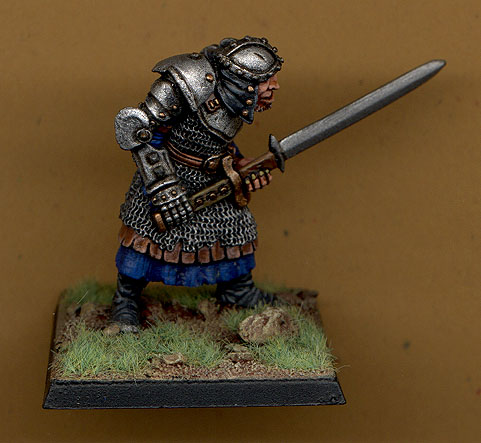 These are "Turok" mark 1 and 2. No 1 was a proper Earthdawn mini, which I think was sculpted by Chaz Elliot. I liked the I gauntlet look, it reminded me of FFVII. Mark 2 on the right was for when I got the character a bit more beefed up but I never used it since I realised there was no way thet guy would pass for an Elf. The mini is a Firstborn Greatswordsman from Chronopia, I loved everything about this mini when I saw him, very dynamic muscular great pose and a funky sword. If you look carefully the ribbon on his chest has the Japanese "Fu-Rin-Ka-Zan". This is one of my first efforts at this deep blue since I have a good palette of blues now. I decide I liked it so much that I'd make it the Raiders of the Lost Kaer colour. |