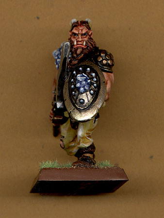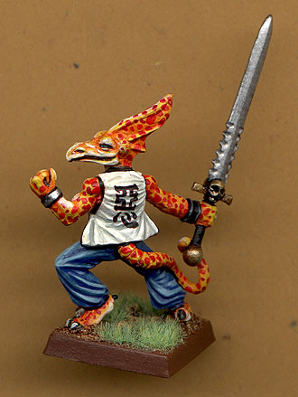 This was the swordmaster "Prath al Orion" he was Horror marked in one game and Kyus "helped him" into another life. I went pretty extreme with the polar colour schem and the spots I think it gives an interesting cross between a tiger and a frog in the look. For the vest I based it one of the characters from Rounan Kenshin it has the Kanji for "Bad" on his back. If your wondering about the big sword it's made by Oz Made Miniatures. |