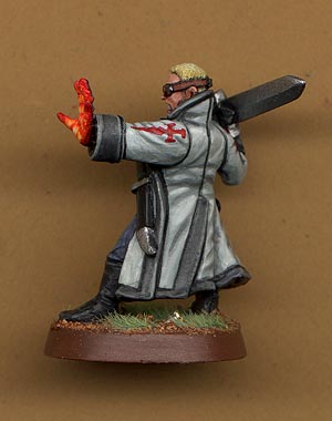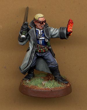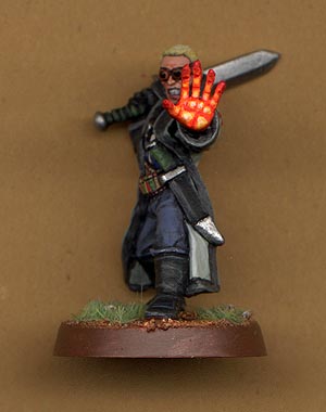 Meet Amroth Van Storme, human Elementalist on a mission from Thera. This is probably one of my most over the top minis, especially for fantasy. I got the idea to try and recreate Seather from Final Fantasy 8, so I had a look through my box of Delaques and found the leader had the funkiest pose and the closest to what I wanted. So I first cut off the left hand with the bolter, then I removed the pistol from the right hand. I then remodelled the grip in the right hand an and added the sword from another mini. I then went through the GW zombie sprue and found an open left hand, perfect for casting a fireball. Next up was to remodel the cuff on the left hand with greenstuff as well as give him hair. I also removed all the snake patterns from his collar. After that painting him was kind of easy. I'm very happy with his hand it came out really well and surprised everyone when they saw him. Side note - since I sacnned him I noticed that the hilt of his sword broke off so I've remodelled it with green stuff with the head of a tiger as the pomel. |