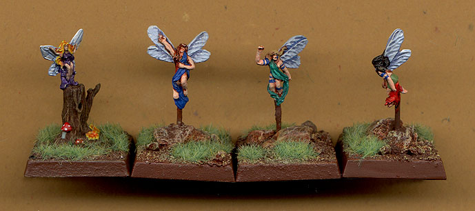 Heres a bunch of windlings used in our game. The one on the far left is from Castle Falkenstein, the other 3 are from the Ral Partha Fairy ring, an odd mini from the AD&D line that I wish I bought another copy of. |