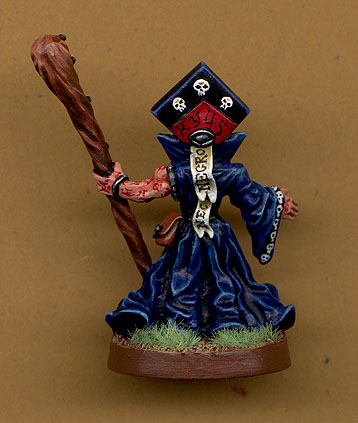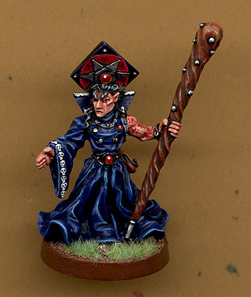 This is "Kyus the Dark Spider" our groups evil barstard. He's a nethermancer who seems to be the student of the campigns main bad guy. The mini is again a Heartbreaker Chaz Elliot mini. It really suited the character since he has his grimaur tatooed on his arms. As you can see I've again used the same blue scheme. I added the skulls on the clothes to give that grim look. |