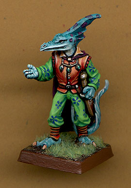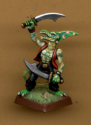A couple of T'Skrang minis from Earthdawn. These are probably the most accurate to illustration miniatures in the range. I really loved the personality that they had. The left one is now a member of our party and is known as "Chicago Ke Ke Ke" the wizard. So far he's proved a vaguely useful coward. Anyway back to the minis as you can see I've done a light underside - coloured back style in various colours with contrasting spots. For something differant I tried some blossoms on Chicago's pants, and for real contrast I did his vest in orange red. On the swordmaster I've tried some tatoos to make him more interesting. |