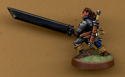 This is "Turok" mark 3. It's a Heartbreaker - Chaz Elliot - Elf spearman. I was looking for a mini that had a pose that I could make a huge sword beleivable. The Zanzba sword [a type of Japanese sword used to off cavalry much like a halbard] was carved from Evergreen plastic sheet and rod. The rune on the blade was engraved with my trusty Dremel. I also added the dagger at his shoulder and the pair on his back as well as the sword from the old Grenadier weapon pack.