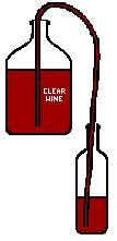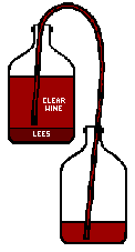 Racking When the wine has stopped fermenting (it has stopped bubbling) it has to be racked. The wine has to be siphoned to another bottle leaving the sediment behind. The process has to be done several times so that you end up with a clear batch of wine. Racking is done like this: Find a carboy or big bottle to take all the wine. Clean the bottle and all equipment and sterilize with sulphite solution. Rinse with water. Dissolve a crushed campden tablet in half a glass of water and pour it into the empty bottle. Then syphon the clear liquid without aspirating the leece at the bottom of the vessel.Discard the leece and siphon the wine back again. You will lose some volume here, so you'll have to refill the bottle to the top. You can use excess wine if available or water. Make sure that you've refilled the fermentation bottle within a day to avoid too much oxidation. You'll have to repeat this sequence every time a reasonably thick layer of sediment has accumulated untill the wine is clear. About three rackings should do. If the wine doesn't clear out , there are fining agents like bentonite to help you out. If you don't mind the haze, don't worry. |