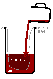 Transfer to secondary Fermentor Red When the color and tannin extraction has been sufficient (a few days to a week after fermentation start) the must needs to be transferred to the secondary fermentor (a carboy ). The sediment and cap have to be separated from the wine. This can be done by straining. You may want to take a hydrometer reading here, if you have one. It should have a SG of 1030 at this point. Before straining clean the secondary fermentor and all equipment that's going to be used and rinse them with a sulphite solution. Clean and sterilize another bucket and put a nylon straining bag into it. Pour the must through the straining bag. You can use a measuring cup to do this. Avoid excess splashing. Take the bag out of the must and gently press the liquid out.Dispose of the solids. Pour the wine into the secondary fermentation vessel . After straining, place an airlock at the top of the carboy. Do not fill the carboy completely yet, because more foam will form. If you've made some excess wine that doesn't fit the carboy, put it into a smaller bottle, also under airlock. You can use it for topping up while racking later on in the process. |