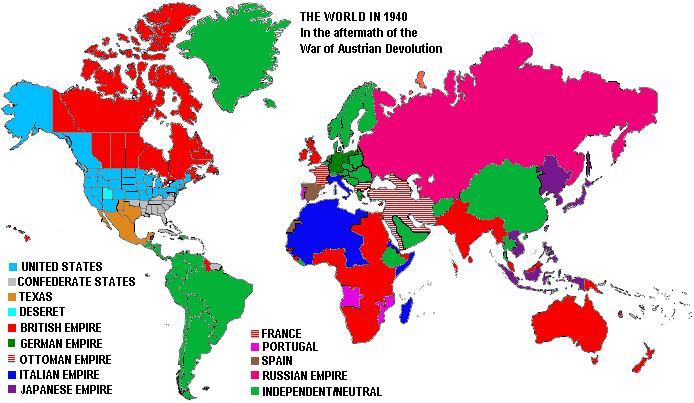 --The fate of Germany's colonies in South America causes much discussion and dissension at the conference, as Britain, the U.S., Texas, and the Confederacy all put in claims. The three American republics take a united stand against the expansion of British territory in the Americas, and Britain reluctantly relinquishes it's claim. The U.S. also bows out, as the South American colonies are a long way away, and the general feeling among the U.S. population is tending, by this time, once again toward isolationism. In the end, the colonies are awarded to the Confederacy, as public outcry against the atrocities committed by Texas in Mexico and Oklahoma lead most nations to adopt a "anyone but Texas" attitude.