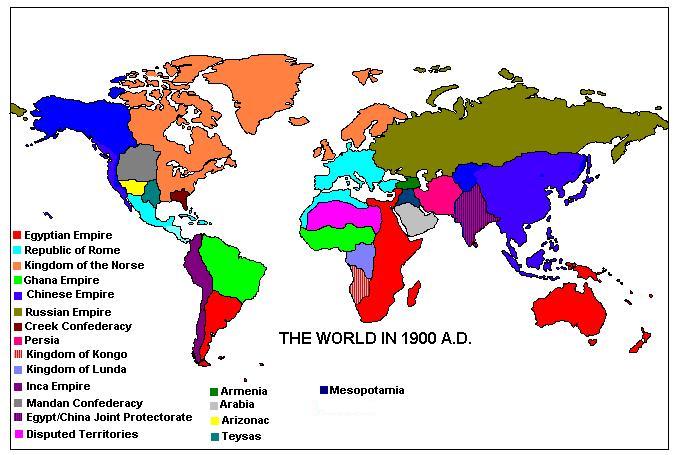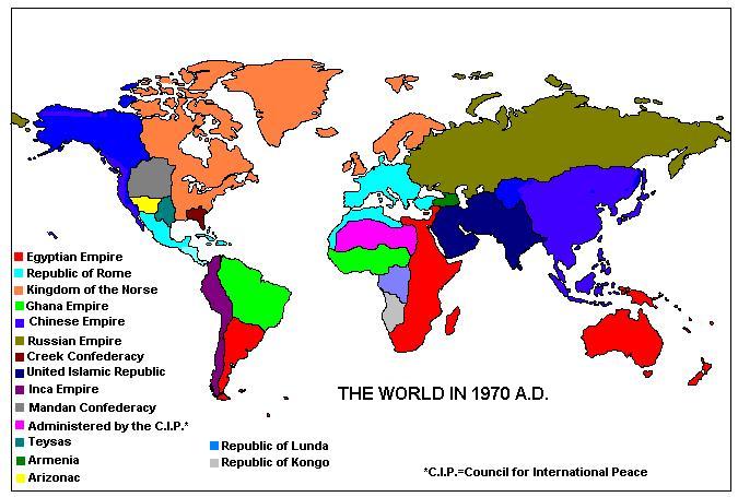 --Religion: Egypt, of course, continues to practice it’s old polytheistic religion. The great temple at Karnak has been continually expanded by Pharaohs over the centuries, and has grown into a virtual religious city in and of itself, the holiest place in Egypt. The cults of Osiris and Isis have emerged, over many centuries, as supreme, but most of the old gods are still worshipped in some form. There are also communities of Christians (although Egyptian Christians are generally considered heretics by the main church because of their unusual interpretation of the Holy Trinity...which they identify with Osiris, Isis, and Horus...and other unusual doctrines) and Manicheans (the last such community in existence anywhere in the world). China also is a polytheistic state, where a mixture of Taoism, Buddhism, and (in the Indonesian Archipelago especially) Hinduism is practiced. The Romans, Norse, Armenians, Russians and Ghanaese are all "Christian." Basically this is the Catholic Church, although not exactly the same as OTL, as the church has not been influenced by conflict between the main church and the proponents of various Eastern heresies (Nestorianism, Arianism, etc.) which never arose in this world (most of these arose in lands which are under the control of Egypt, and they thus do not arise in this TL). There was never a "Great Schism" (i.e. the split between Rome and the Eastern church which created the Orthodox Church in the OTL) in this world, as the Great Schism arose in great part because of a conflict for power between the Byzantine Emperor and the independent Pope at Rome. Since there was never a Byzantine Emperor or an independent Pope at Rome in the ATL, this never occurred, and the church remained united. And, since the Bishop of Rome has never been in a position to contend for temporal authority, and has been, to a large degree, regulated by the Emperor/Senate of Rome, the abuses which finally lead to the Reformation never occurred. There is no Martin Luther or John Calvin or equivalent figure in this world as a result. Kongo and Lunda practice a mixture of Christianity, native animism, and Egyptian polytheism. The Incas, Creeks, and Mandans all practice their own native religions, although of course missionaries from Rome and the Norse have made many converts in those lands, and the native religions themselves have been very modified by contact with the faiths espoused by the major powers (for instance, the Inca no longer practice human sacrifice). Islam is practiced in the United Islamic Republic...where it is the only religion allowed to be practiced...and has adherents in Egypt’s Syrian provinces, Rome’s Asia Minor possessions, Armenia, southern Russia, and China as well.