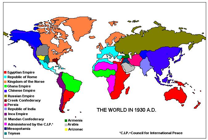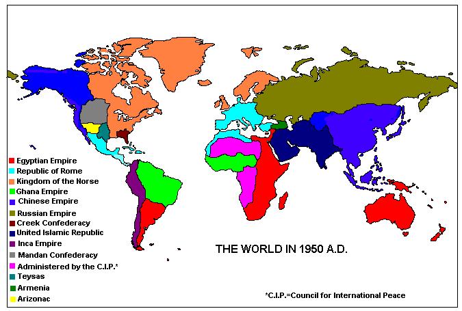 1909-1912 AD--War between Teysas and Arizonac. Teysas dictator Quanah Misae, who overthrew the democratically elected government in a coup the previous year, covets the rich mineral resources (especially gold, silver, and copper) possessed by his neighbor to the west. In early 1909 he declares war on Arizonac. Teysas troops cross the border and move rapidly toward the Arizonac capital, but are halted at the Pecos River. Teysas is a Roman client state, and Arizonac is a Chinese client, and both powers funnel arms and supplies to their respective proteges, and fighting bogs down. Neither of these countries is a nuclear power, and so their conflict does not receive undue international attention initially. But the Mandan and Creek Confederacies are concerned by the conflict, happening, as it does, virtually on their doorstep, and in 1912 they appeal to the Council for International Peace to intervene. They are supported in this appeal by Egypt, Ghana, Russia, and the Inca Empire (Rome, China, and the Norse...who are also profiting by selling weapons to both sides...vote against intervention), and the C.I.P. issues an ultimatum to Teysas...withdraw from Arizonac or face sanctions up to, and including, possible multi-national military intervention. Quanah Misae approaches Rome for support, but is refused and advised to back down, which he does, reluctantly. A C.I.P. peacekeeping force is placed on the border between the two countries to prevent future outbreaks between them.
