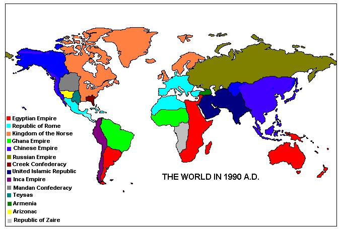 --Politics. Egypt’s constitutional monarchy has seen quite a bit of development since the last formal amendment of the constitution several centuries ago. The enfranchised segment of the population, which once consisted only of the nemhu (property owners), has been gradually expanded over the centuries, and now encompasses nearly everyone in the Egyptian Empire. The power and influence of the Council of the 400 Elders has also increased, to the point where Pharaohs...who under the Egyptian Constitution have the power to spend state revenues as they see fit...now customarily seek the approval of the Council before making large expenditures out of the treasury. China, Russia, the Inca Empire, and the Norse Kingdom have very similar political systems (indeed, those of China and the Inca Empire are modeled on Egypt’s, with Constitutions adapted, almost word for word, from that of Egypt). Rome, on the other hand, serves as the model for the other major political system in the world...the Republic. Rome’s system, like Egypt’s, has seen much development over the centuries. The franchise, which originally only extended to property owners and soldiers, has been expanded, and like in Egypt, now includes nearly everyone in the country. Other countries whose political systems are based on that of Rome (although most have a single President instead of Rome’s system of two Consuls) are the Creek and Mandan Confederacies, Teysas and Arizonac, Kongo and Lunda. Ghana is the world’s only remaining absolute monarchy, with a Soninke royal house which has ruled continuously since c. 750 AD (although in exile in Vinlandia for part of that period). However, the Ghanaese King is advised by a council of the kings of the various subject tribes which make up the empire (Mandinke, Hausa, Ibo, Yoruba, Bini, Songhay, and many others). This council, although it holds no formal power, exerts a powerful restraining influence on the actions of the Ghanaese King...who realizes that if he upsets enough of the subject kings, his empire will quickly fall apart. And finally there is the United Islamic Republic, which is an authoritarian military dictatorship.