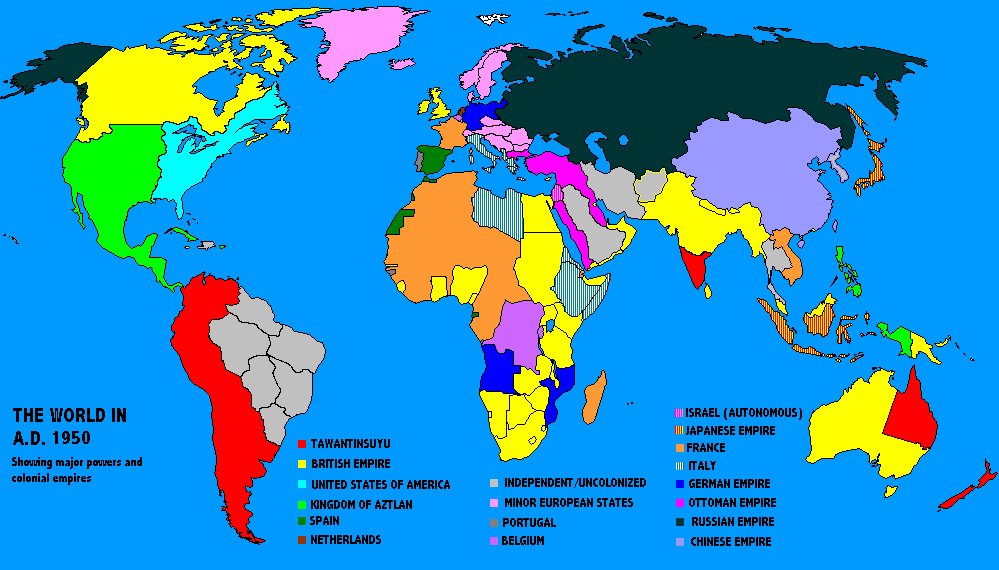 During this same period, insurrections (generally, but not always, lead by Marxists, some of them inspired by refugees from the failed Popular Front revolt in Tawantinsuyu) will break out in the various colonial empires, as people yearning for independence from colonial rule take up arms. The process leading to the formation of independence movements has taken somewhat longer than in OTL, due to the fact that the major colonial powers...France and Britain primarily...managed to remain out of the major wars of the first half of the 20th Century, and therefore their resources and ability to hold down their colonial empires has not been depleted. Furthermore, unlike in OTL, there are no communist governments secretly providing support to local Marxist independence movements, which must operate entirely on local resources. Nevertheless, by 1950, rebellion is breaking out all over. After years laying the groundwork, Ho Chi Minh creates the Viet Minh, a Marxist guerrilla force which opposes French occupation of Vietnam. Marxist guerrillas also begin an uprising in Cambodia against French rule. Achmed Sukarno begins an insurrection against Japanese rule in the former Dutch East Indies. Rebellions against British rule break out in Burma and Malaysia. By far the most serious disturbances are in India, where continued British intransigence against the demands of the Indian National Congress for Home Rule, have finally pushed the leadership of the I.N.C. away from the pacifistic policies of Mohandas Gandhi and toward the more belligerent stance advocated by such leaders as Subhash Chandra Bose, who advocates armed resistance aimed at the complete independence of India. The Tawantinsuya colony in India, while less affected by these events, is not immune, as despite the comparatively enlightened policies followed by the Tawantinsuya, there is still a large segment of the population which wishes to free itself from foreign rule, however benign. And in Africa, liberation movements begin guerrilla struggles in colonies across the continent.