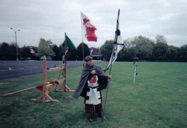 Page Kenneth stands vigilant barring the pennon of his knight Sir Vivian.
