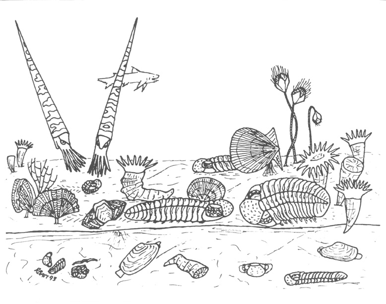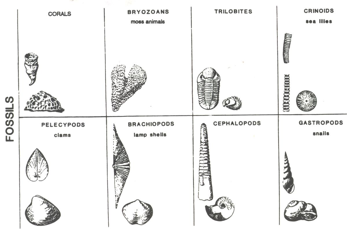 | Different fossils are found in the Penn Dixie Quarry. The fossils are of the Paleozoic Era, mainly from the the Devonian and Silurian Era. The fossils were once marine organisms such as horn corals, brachiopods, and gastropods. These fossils are shown in the picture below (Figure 1). They're 443 to 362 million years old. At the time they were deposited, the area was a shallow tropical sea (being 20 to 30 degrees south of the equator. The fossils are in shale, which was once mud. |