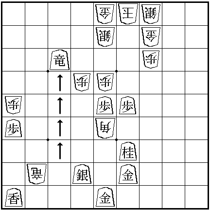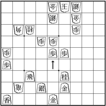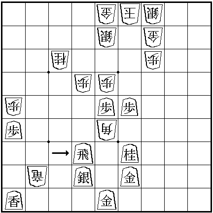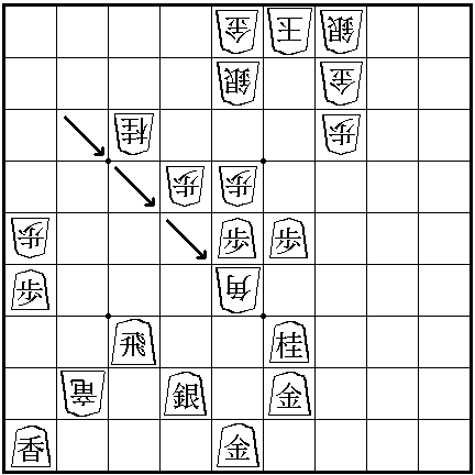 My comments are on this game are - The artists obviously did not take the time and effort to make this game 'realistic'. My diagrams are based upon 3 different pictures of the Shogi board in the anime. The first picture shows middle section of the board only. All the pieces are moved by one row from the dots that divide up the board, from my diagram. In the last picture the pieces are in the same position in relation to the dots as they are see in my diagram. However in that last picture in the anime, Jet's silver general is missing. Also Spike's Silver General which is closest to the center is missing. Neither of them could have been taken because the only moves are the three I've shown above. Spike's comments about, 'if Jet takes his finger off then it's consider a move', is also bogus. Jet is pointing to Spike's Bishop. Obviously Jet is not allowed to move Spikes pieces. Rather Jet is indicating the square that he wished to drop a piece onto (none of the pieces on the board can move to that square). But Jet cannot move there now because Spike has placed his Bishop there. Which is actually a useful tip, sometimes it is handy to place one of your pieces on a square that would be good for your opponent to drop their pieces on, thus stopping them from making the drop. Finally the move that the dog makes is utter rubbish. Remember in the anime for some reason they didn't draw the Silver General below the Rook, so in the anime at that point the Rook is guarded by nothing and so Spike could take it for free with his Bishop. It would have been better for Jet to have moved his Rook to take Spike's knight and promoting his Rook to a Dragon.