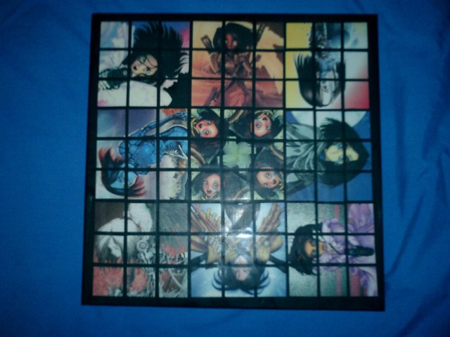 This is the back of my homemade Shogi Ban. It has Battle Angel Alita (Gunnm) pictures decopaged onto it