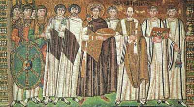 Justiniano y su Corte. Mosaico Mural de San Vitale. Ravena. |