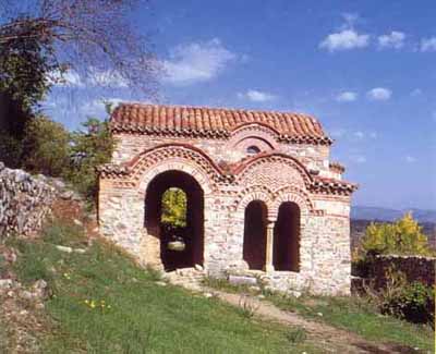 Muy cerca de la Períbleptos, en la calle principal de la ciudad, se encuentra la capilla de San Jorge, una de las más representativas. Prácticamente todas las capillas de uso particular con fines funerarios que trufaban las calles de Mistra presentaban la misma estructura, siendo pequeños recintos abovedados con ábside. Hacían las funciones de panteón familiar, y las tumbas encontradas en ellas fueron reutilizadas numerosas veces. San Jorge presenta una elegante combinación de materiales, ya que, a pesar de que la estructura principal es de piedra, los juegos decorativos con el ladrillo le otorgan una gran vistosidad. |