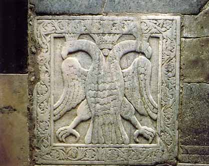 Bajorrelieve con el motivo del águila bicéfala, emblema de la dinastía de los Paleólogos, que se encuentra en el enlosado de la catedral. La tradición dice que sobre esta lápida fue coronado en 1449 Constantino XI Paleólogo, el que sería el último emperador bizantino. |