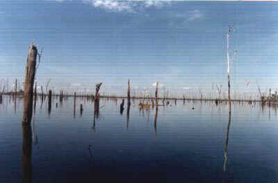 inundam as florestas adjacentes alagando dezenas de quilômetros de ambas as
