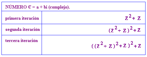 El Conjunto de Mandelbrot es mucho más complejo que la imagen vista anteriormente. Pero su generación es lo interesante. El Conjunto de Mandelbrot se forma mediante un NUMERO COMPLEJO (a+bi, A y B nros. Reales; i=unidad imaginaria) que se dice "especial". Entonces, tenemos el número complejo Z = a+bi, al cual se lo somete a una "prueba matemática". Para ello tomamos el número Z y lo elevamos al cuadrado, sumándoselo después al mismo Z. Luego, elevamos ese resultado y lo elevamos nuevamente al cuadrado, sumándoselo a Z y así infinitamente (iteración). Representemos esto: