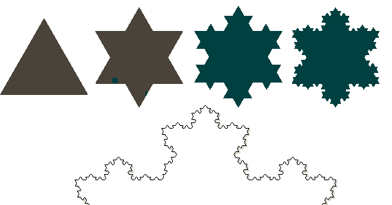En la imagen, la figura representada es conocida como el Copo de Nieve de Koch o la Isla Triáda de Koch y se forma a partir de un triángulo equilátero al cual se dividen sus lados en tres partes iguales, de forma tal que en los tercios medios se coloca otro triángulo semejante al primero. Esta iteración, en un alto grado de complejidad, se asemejará a una circunferencia, ya que los triángulos se irán colocando infinitamente. Esto reafirma el concepto de Area finita y Perímetro infinito. Claro está que los fractales son también números (en efecto, la iteración de un número Complejo simple, por lo que pueden traducirse en operaciones matemáticas).