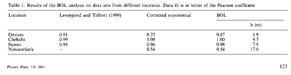 Uma analise de regressão linear , com y interceptada forçada em zero , foi efetuado com os dados de Levengood e Talbot ( 1999) usando os valores publicados de NL , N0 e d e omitindo os "tufos centrais" . O novo parametro , h , foi otimizado para um melhor encaixe de dados para 1/r2. Como uma ilustração , Fig. 2 contem os resultados das analises do BOL para a formação Sussex de 1994 para um valor de h = 7,8 m . Os resultados para outras formações são listadas na Tabela 2 (terceira coluna ) . Os coeficientes Pearsons são todos elevados comparados com os modelos anteriores , e revelam que em todos os três casos reportados por Levengood e Talbot ( 1999) , a expansão do nódulo correlata perfeitamente com a distribuição de intensidade eletromagnética no solo , assim como iria resultar de uma ponto-fonte em uma altura finita acima do campo . Em seguida , a analise do BOL foi trabalhada em uma ajuste de dados obtidos pelo autor 3 dias depois da aparição de uma formação feita à mão em 1997 ,( em Nieuwererk , Holanda ), empregando metodos identicos como os descritos em Levengood e Talbott ( 1999) . ( Neste caso a haste do trigo estava mecanicamente aplanado . Apesar de que o aumento do comprimento pulvinus foi assumido como um efeito de gravitropismo.) Os resultados da analises do BOL podem ser visto na Fig. 3 e Tabela 1 De forma interessante , o valor mais alto do coeficiente Pearson , que pode ser obtido manipulando a altura presumida , h , do BOL , estava limitado à 0,54 para h = 17 m . Da Fig. 3 , ele pode ser confirmado que existe de fato nenhuma dependencia entre as coordenadas horizontais e verticais . Os pontos dados parecem perder o caracter estruturado que parece estar presente nos casos anteriores.