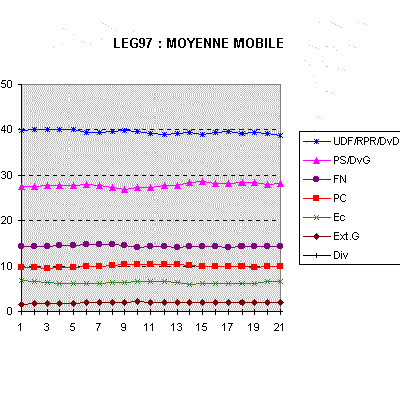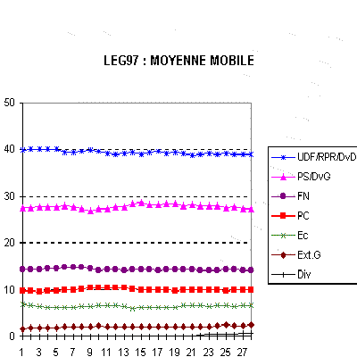 A ce stade, il doit être clair que ces projections n'ont qu'une valeur indicative. Toutefois, les trois dernières enquêtes publiées montrent à la fois une érosion des intentions de vote pour les candidats UDF/RPR/Divers droite et une augmentation du nombre de leur sièges potentiels par rapport à la semaine précédente (BVA/Match : -2,5 points, + 9 sièges; CSA/Parisien : - 1 point, + 16 sièges; Louis-Harris/Valeurs act. : -1,5 points, + 25 sièges).