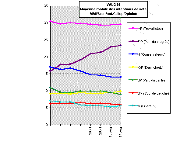 Grandissime favori il y a un mois, le Parti du progrès a perdu la moitié de ses électeurs pendant la campagne. Les autres formations, à commencer par le Parti travailliste, ont souligné les contradictions de son programme économique et l’immigration est ici un thème qui ne fait recette que jusqu’à un certain point. Un sondage (MMI/VG, publié le 14 septembre) montre que la politique de la santé demeure la question prioritaire chez les électeurs, l’immigration n’arrivant qu’au neuvième rang, derrière par exemple l’éducation, la politique fiscale ou l’environnement. On sera probablement loin du raz-de-marée qu’avaient laissé entrevoir les sondages du mois d’août, mais le mouvement de Carl I. Hagen devrait réaliser une percée significative.