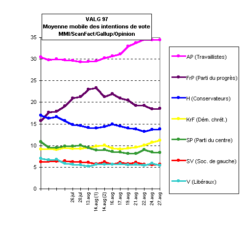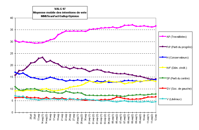 On s’efforcera ici de donner l’information la plus complète possible. On donnera les intentions de vote au dixième de point près comme il est de coutume en Norvège. Mais vu les marges d'erreur inhérentes à tout sondage, il faut souligner qu'un tel degré de précision a quelque chose de surréaliste...