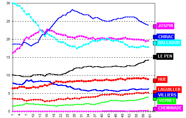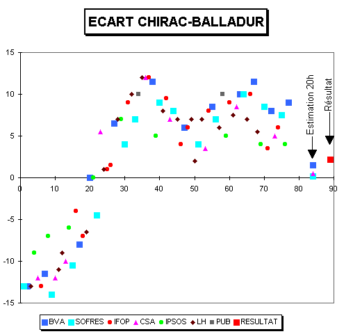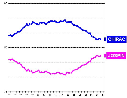 (13) Il ressortait de ces deux enquêtes, effectuées sur le terrain respectivement du 13 au 15 mars et du 10 au 11 avril, que Jacques Chirac se situait autour de 30 % d'intentions de vote. Les autres instituts ayant donné des "coups de sonde" entre le 10 et le 11 avril tombaient quant à eux entre 25 et 26,5 % pour le candidat gaulliste.