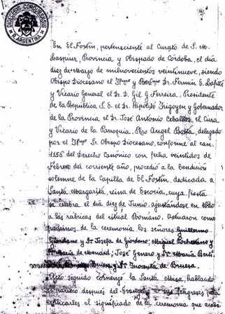 Así, los primeros forjadores de nuestro pueblo unieron sus voluntades tras la iniciativa de erigir una Capilla de El Fortín y seguramente la idea y los esfuerzos multiplicados en cada habitante de este suelo vio su fruto el 10 de Marzo de 1929 cuando era bendecida la Capilla y su sacra figura se elevaba por entre las casas de un pueblo incipiente en su formación.