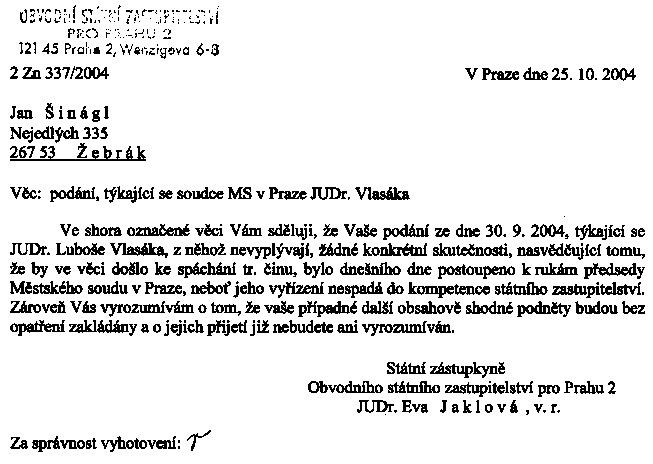 Dopis 2 Zn 337/2004 ze dne 25.10.2004 – JUDr. Eva Jaklová