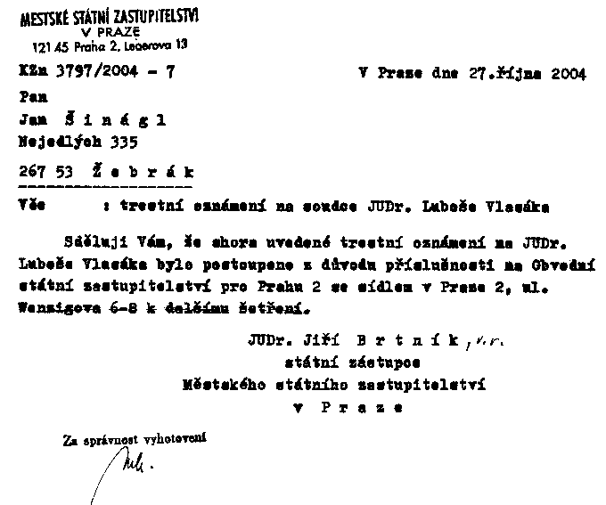 První údiv vzbudí datumy! JUDr. Jiří Brtník, státní zástupce MSZ v Praze 2, Legerova 13, mně sděluje dopisem datovaném 27.října 2004 – KZn 3797/2004 - 7, že mé trestní oznámení na soudce JUDr. Luboše Vlasáka, bylo z důvodů příslušnosti postoupeno na adresu MSZ v Praze 2, Wenzigova 6-8.