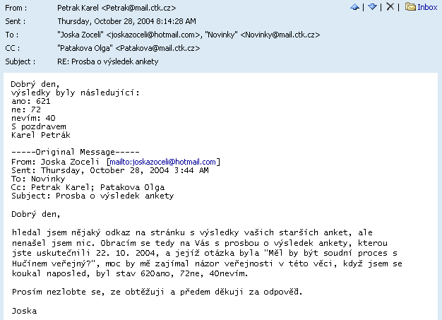 v návaznosti na Vaši e-mailovou zprávu ze dne 25. 10. 2004, týkající se, mimo jiné, výčtu Vašich připomínek k mé práci a odvolávání se na článek Lidových novin ze dne 20. 10. 2004, si Vám dovoluji sdělit následující skutečnosti: