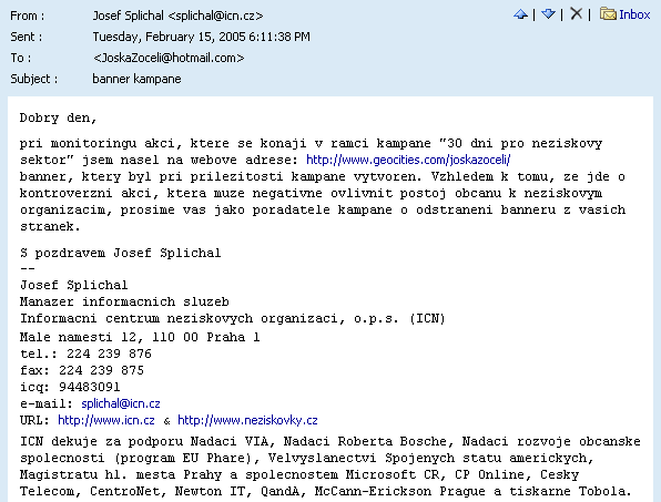 Představa, že o takovéto věci vůbec diskutuji s ředitelem ICN mne šokuje.Vaši žádost, aby pan Joska (jehož identitu neznám) stáhl ze svých stránek u mého článku logo akce 30 dní pro neziskový/občanský sektor rozhodně nepodpořím – jde o stránky nazvané: fórum angažovaných občanů. Projekt "30 dní" vám ani ICN nepatří. Pouze jej koordinujete a sháníte na jeho celorepublikovou propagaci peníze. Nebo se pletu? Nebo máte nějakou komisi?