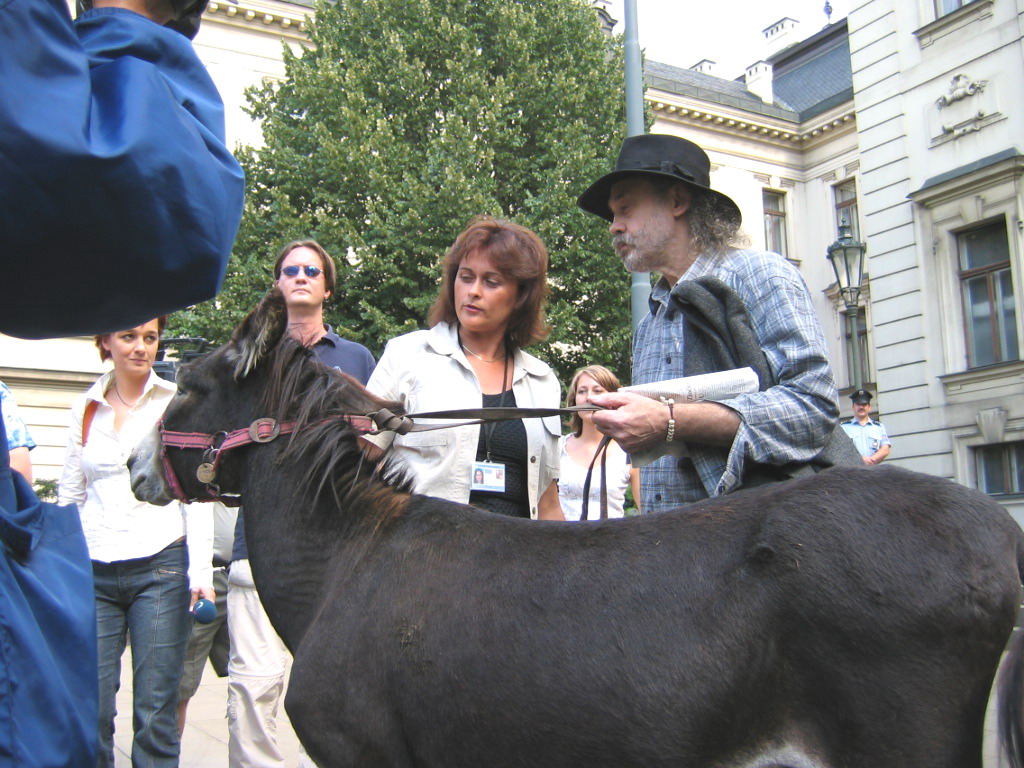 ••• spolecne s basnikem Ivanem M. Jirousem jsme reagovali na zakrok policie pri pokojne kulturni akci CzekTek u Bonetova na Tachovsku. V prohlaseni, ktere bylo napsano ostrejsim tonem a vzbudilo i negativni reakce, zadame mimo jine odstoupeni s. Grosse (cele zneni v priloze). Jelikoz nam na nej i prez radu urgenci nikdo neodpovedel, rozhodli jsme se navstivit urad vlady osobne a to zitra kolem 14. hod. spolecne s oslem Bibou a kozly Matejem, Parcifalem a Legolasem. Vsem kterym se tento zpusob libi vzkazujeme, ze se k nam mohou pridat.