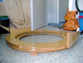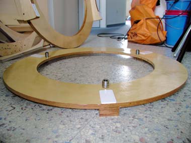 Höhenräder: Hauchdünne Sicheln aus 22 mm Multiplex, Gleitbelag Glassboard. Befestigung erfolgt mit Sterngriffen. Die Höhenräder haben auch eine tragende Funktion: Sie nehmen die unteren beiden Rohre auf. Die Stabilität entsteht durch ein zusätzliches Querrohr. |