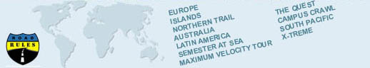 | Past Seasons USA-1 USA-2 Euorpe The Islands Northern Trail Australia Latin America Semester At Sea Maxium Velocity Tour The Quest Campus Crawl South Pacific X-Treme* |