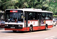 無論是配都普車身抑或是亞歷山大車身的O405巴士,翻新後在車廂右邊都增闢了站立空間,以提高載客量。 拍攝地點:烏節路 |
