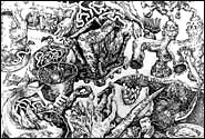 The impression of seething movement which Sylvia Siddell achieves in her drawings contributes to their unsettling qualities. Her early work was done when her two daughters were babies and wouldn't sleep. She spent hours at night pacing the house with them, and felt strongly that household objects remain still only when you look at them, that rooms are filled with activity until we walk in and the objects freeze into immobility again. In her drawings, taps become muscular, and contorted electrical leads and hoses are like knotted snakes or umbilical cords; machines and appliances are twisted and misshapen, buckled and bent. Siddell covers surfaces with pencil strokes which make the complicated, shimmering moire patterns at which she excels. She contrasts the seductive beauty of pencil patterning with subjects which display an edge of grotesque humour. Siddell greatly admires Albrecht Durer's drawings and engravings which show his dazzling control of line. His etching and woodcut media require a linear creation of image; shading is achieved with masses of line rather than areas of soft tone. Sylvia Siddell chooses to restrict herself to line and, using a soft pencil, she suggests a variety of surfaces from gleaming metal to feathers, from soft skin to reptilian scales.