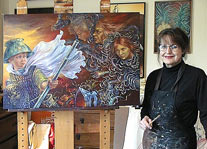 ![]() The artist in her studio with Taming the Furies SYLVIA SIDDELL ONZM Born Auckland 1941 Sylvia Siddell has exhibited regularly throughout New Zealand since 1975. She has also exhibited in Australia and Spain. Her work is now in many public and private collections in New Zealand, Australia, USA, England, Indonesia and Germany. In the Queen's Birthday and Golden Jubilee Honours 2002 Sylvia Siddell was appointed an Officer of the New Zealand Order of Merit (ONZM) in recognition of services to painting. While still producing detailed drawings her more recent exhibitions have featured paintings in oils SOLO EXHIBITIONS 2005 Artis Gallery Auckland “Couch” 2002 Artis Gallery Auckland “Readings” 2000 Artis Gallery Auckland “Fragments From a Life” 1998 Artis Gallery Auckland “A Rich Life,” 1996 Artis Gallery Auckland “Collections Recollections, “ 1994 Auckland City Art Gallery~ Survey Show "Slaughter of the Innocents" 1995 Hawkes Bay Museum ~Survey Show “Sylvia Siddell’s Dinner Party” 1992 Chiaroscuro Gallery, "Slaughter of the Innocents 1990 Proba Gallery Auckland "Dinner Parties" 1988 Eastern Southland Art Gallery, Gore "Sylvia Siddell, Works on Paper” 1987 His Majesty's Arcade, Auckland, "Beds and Things" 1985 Dennis Cohn Gallery, "Domesticity Revisited" 1983 Louise Beale Gallery, Wellington. "Suburban Morning" Denis Cohn Gallery, "Intrusions" 1982 Denis Cohn Gallery, ,"Separate Rooms" 1980 Barry Lett Galleries, "The Inheritors" Waikato Society of Arts 1979 Barry Lett Galleries, "Cordon Noir" 1977 Barry Lett Galleries, S "One Day in the life of Mrs S.” SELECTED EXHIBITIONS 2004 Artis Gallery Auckland "Drawings". Wairarapa Art Museum, Masterton, "Good Art" Dowse Art Gallery, Wellington. 2002 International Illustration CyberNet Exhibition - Korea. Contemporary Art International Exchange - Prague. Fringe of Heaven, Lopdell House Gallery. 2001 Tane Whakapiripiri Awataha Marae Tooth and Claw Auckland City Art Gallery. 2000 Liquid Jade Manawatu Art Gallery Palmerston North 1999 Conversations with Judy Chicago Fisher Gallery After Dark Robert McDougall (Christchurch Art Gallery 1998 Re-visioning the Real A Touring Exhibition N.Z. 1997 Art in the City Lopdell House Auckland 1996 Food the Vital Stuff - Auckland City Art Gallery 1995 Persuasion of the Real - A Touring Exhibition Lopdell House Gallery Hawkes Bay art Museum Gisborne Art Gallery Manawatu Art Gallery 1994 Lopdell House "Domestic Bliss" 1993 Portfolio (and Tour N Z ) "Peaceworks" Dunedin City Art Gallery "From Liquid Darkness" Judith Anderson Gallery "Centennial Suffrage Year" Robert McDougall Gallery Christchurch George Fraser Gallery "Temple of Flora" Chiaroscuro "The Modern Myth" 1992 Canterbury Society of Arts, Real - Surreal Mt Eden Artists in Action Artis Gallery, Auckland, Interiors Waikato Art Museum, Works from the Collection Epsom Girls' Grammar School Chiaroscuro, Urban Metamorphosis Outreach, Marks and Milestones Artis Gallery, The Figure Customhouse Auckland, James Wallace Collection 1991 Robert McDougall Art Gallery, Images of Home and Garden Aotea Centre, Auckland Children's Hospital Chiaroscuro Gallery,Opening Show, New Visions Northland Gallery, Whangarei. Auckland Printmakers Pumphouse Auckland, Prestigious Artists Canterbury Society of Arts, The Chair Portfolio Gallery, Auckland Drawings Auckland Society of Arts, Work by the Tutors Charlotte H Gallery, Still Life 1990 Aotea Centre Auckland "Curtains Up' Artspace Auckland, Art Against Aids Muka Studio Youth Prints in Auckland Wellington and Christchurch Lopdell House, Wild West Art Show Outreach, Cover to Cover (books) Canterbury Society of Arts, Self Portraits Auckland Society of Arts, The Tutor's Show 1989 Auckland City Art Gallery, Artist's Choice Brisbane, Mezzanine Gallery. International Women Artists Eastern Southland Museum, Gore. Guest Artist Outreach, Elegant Miniatures Muka Studios at the Regent, Past Present Future Louise Beale, Wellington. Christmas Show 1988 Auckland City Art Gallery, Indoor - Outdoor Auckland Museum, Art of Nature Robert McDougall Art Gallery, Paper Treasures Dowse Art Gallery, Recent Acquisitions Te Awamatu Arts Festival Jeanne d'Estienne Gallery, Opening Show 1987 Fisher Gallery Pakuranga, Screens Auckland City Art Gallery, Lithographs for Youngsters Wellington City Art Gallery, Lithographs Aids Foundation Auction Louise Beale Gallery, Wellington Auckland Society of Arts, Tutors Mt Eden Festival 1986 Auckland City Art Gallery, The Print - Methods and Masterpieces Suter Art Gallery~, Nelson. The Self Wellington, Flying Kiwi Arts '86. Visual Diaries Suter Art Gallery~, Goodman Suter Biennial Auckland City Art Gallery~, Works From the Collection Melbourne Etching Supplies, N Z Printmakers Lopdell House Auckland, Opening Show Robert McDougall Gallery, A Piece of Art for Peace 1985 Auckland City Art Gallery, ANZART 85 Artist's Book Show Louise Beale Gallery, Wellington Brooke Gifford Gallery, Christchurch Fisher Gallery, The Folding Image (screens) National Gallery, Wellington. Recent Acquisitions Auckland Society of Arts, Drawings National Gallery Wellington, Content - Context 1984 Auckland City Art Gallery, "Anxious Images" Aspects of Recent New Zealand Art (Toured New Zealand) Robert McDougall Gallery Christ church Outreach, Visual Diaries 1983 Rotorua Art Gallery~, Guest Artist Finalist, Team McMillan Ford Competition 1982 Bilbao Spain,Muestra Internacional de Arte Grafico "Arteder 82" Hawkes Bay Art Gallery~, Napier. Guest Artist Outreach, Women by Women New Vision, Auckland Festival Exhibition Maidment Theatre, Festival of Feminist Art 1981 Outreach, Works on Paper by Women New Vision, Amnesty International Manawatu Art Gallery, Artist's Boxes Outreach, Images of Men Elva Bett, Wellington, Christmas Show 1980 Barry Lett, 15th Anniversary Exhibition Outreach, Women in the Arts Peter Webb, Kites and Masks Wellington Womens Gallery 1979 Dennis Cohn Gallery, The New Zealand Nude Peter Webb Gallery, Figurative 