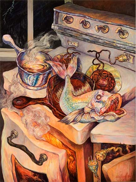 BETWEEN FIRE AND RAIN Sylvia Siddell’s depiction of familiar objects, while surging with energy, refers to the 17th century tradition of Still Life painting with hints of the transitory nature of material goods and the frailty of human existence. Issues of fertility, fecundity , danger and decay are raised in her work as the fire and passion of youth become the drizzle and dilapidation of old age. Below is an image from an exhibition of paintings and drawings which was held in March 2008at the Judith Anderson Gallery, 28 Hastings St, Napier,New Zealand,tel 64 06 8355 607