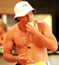 | D.O.B: 25 November 1977 Star sign: Sagittarius Occupation: Navy Chef Describes himself as: �Outgoing, immature and funny.� Dream job: Physical training instructor. Aaron also wants to have a happy marriage and kids he can train to be the best sports stars ever, making him even more rich and famous. Aaron says: �I�m an extrovert, so I�ll be playing it up for the camera.� Will miss: His fianc�e Emily, and playing sport. If I were a rock star I would be: Tom Jones, he's still a sex symbol. Most shaggable celebrity: Kim Kilby from Funniest Home Videos. Fashion style in two words: Trendy, original. Favourite Madonna song: Like a virgin Lives: Wagga Wagga NSW Marital Status: Fianc�e of two years, Emily Reeves (25) (Separated) Biography! from Big Brother and NW, 15 April 2002 Photos Other Information NEW 11 November 2002 Housemate Update When we spoke to Keiran, he�d just come back from Wollongong, where he and Aaron had been helping Pete celebrate his birthday. Keiran was keen to tell us that Aaron has dyed his hair white. 2 July 2002 Big Brother Generation The Monica Lewinsky Award for too much information: To Sydney chef Aaron, who felt compelled to share with the nation the details of his personal hair-removal routine (he was not referring to his eyebrows). A close second goes to Keiran, for 'fessing up to keeping a blow-up doll under his bed. Of course, he's never used it. 1 July 2002 Aaron & Emily Although Aaron Benton and fiance Emily Reeves are still living together, they're officially "having a break". Seeing Aaron cosy up with fellow housemate Shannon was too much for Emily, who ended up spending time in hospital over the incident. Emily says Big Brother "brought out a few issues", which need to be sorted out. "We're not breaking up," she says. "We're just putting things on hold for a while to iron out the wrinkles. You have to make sure everything is OK before you venture into [marriage]." Aaron says, "We're not engaged at the moment, but we're not throwing away our relationship fully. And I'm not going to go and sleep with a million chicks, either. If we can work out our problems in the next month, the engagement and the wedding will be back on." NW predicts: Troubled times ahead. The long-term outlook isn't promising. NW 9 June 2002 I also met Brodie and Nicole and both are cool kids. I actually found out that Brodie goes for Collingwood as well as myself and Alex, so we are planning a day at the footy together in the next two weeks for a home game. Now that should be fun! The other big event this week was the WHO photo shoot on Friday, well that was the first time we had all been together� and it rocked. Nathan was insane as usual, Alex was unimpressed and disinterested, Brodie was charasmatic, Nicole was hot, Shannon was "the best", Turkan was my best mate, Damian was Cleo bachelor of the year material (well, he thought so anyway) and no, Katrina was not nude�(pity). 8 June 2002 Behind Big Brother This year, Navy boy Aaron looks like having the best deal. He's reportedly been offered $60,000 to strip in four shows with Manpower. 7 June 2002 Evictees Reunited Aaron said seeing Nathan was a highlight. �It was awesome to see Nath and Alex especially. We had a great chat. Nathan and I are even thinking of moving in together in Sydney soon,� he said. 1 June 2002 From Shannon's Diary I have spoken with Aaron who is having a ball with all his mates but no doubt is doing it tough with his "on hold" situation with Emily. By the way, just for the record � nothing, I mean NOTHING, went on with me and Aaron. 1 June 2002 Emily and myself are cool, and we are still the best of friends. We have not separated for good like people are speculating, we are only taking a break so that we can concentrate on fixing what went wrong. Big Brother wasn't solely responsible for what happened between us. There were other life pressures as well. All those out there in relationships will know what I'm talking about. - Aaron and his fianc�e are officially on a break. 29 April 2002 (Day 22) Aaron said "Credit goes to Kat and Mirras for their effort in the looming task, they put in the hard yards for this task and they should be proud of themselves ... because we passed and mostly from their effort." 25 April 2002 (Day 18) Nathan and Aaron discussed wedding plans. Az wants something simple like at the beach with a reception at the footy club. 25 April 2002 (Day 18) Aaron is still wearing his navy hat. The HMs wondered why he's wearing it since he seems to hate the navy. He responded: "I don't hate the navy, I love the navy, I just hated being a navy cook". The HMs then asked "why do you love cooking for us then", to which he replied "It's fun cooking for 12, but it sucks cooking for 200". 24 April 2002 NOT only is Big Brother responsible for churning out a heap of talentless wannabes, it is now responsible for a new cocktail called The Furious Larrot. "We decided to create this exciting concoction after the BB housemates pulled this new term out on us all," says a spokesman for The Orbit Bar on level 47 at the MLC building in Australia Square. "It's a creamy mixture of Kahlua, Fraise de Bois (strawberry liqueur), peach schnapps and cream, furiously shaken and served in a tall glass topped with a scoop of raspberry sorbet." Article from SMH Gossip Aaron gets his eyebrow pierced by Sahra - making that the second piercing in the BB House. Aaron brought an inflatable penguin into the BB house. 22 April 2002 "Aaron had puppy fat as a kid, but he's shed all that at the gym," says Aaron Benton's fiancee of two years, Emily Reeves, 25. "He gets up in the morning and has a flex in front of the mirror. To his face I shake my head and roll my eyes, but really it's not such a bad body to look at." Oh, Big Brother! P.28 Who Weekly 18 April 2002 (Day 11) Aaron talks about how he met his girlfriend. He said he was umpiring netball and she was hogging the centre so he started penalising her for n