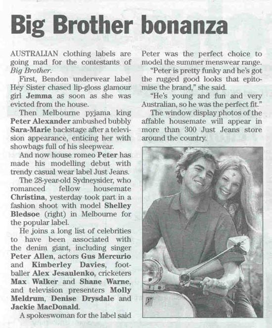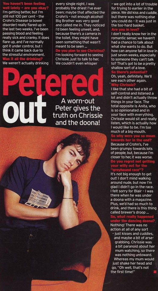 | D.O.B: 26 May 1972 (Newcastle NSW) Height: 180cm Weight: 85kg Star Sign: Gemini Occupation: Viticulturalist and Rock Climber Favourite Actors: Sean Connery, Anna Paquin Favourite Book: A Secret History by Donna Tartt Favourite: Girls with accents Lives: Sydney NSW Family: 7 siblings Martial Status: Girlfriend - Sami Lukis Education: All male boarding school Agent: Peter Chadwick Biography! from Big Brother Photos Other Information 5 November 2002 Cleo Peter Timbs - Big Brother Insider�s tip: He�s well-known for his �dancing doona� antics on BB1, but Peter told www.girl.com.au that the worst pick-up line he'd ever heard was �Do you want to have sex or do you want to lie down while I do?�. Age: 30 Star sign: Gemini Ideal first date: �Dinner for two � there�s no point in mucking around.� Major turn-ons: �Brains and bottoms!� 5 November 2002 Dashing Derby CHIRPY Today show weather girl Sami Lukis and Big Brother Series One contestant Peter Timbs looked quite the happy lovebirds. When a few raindrops began to fall, Timbs gallantly ran into a marquee to grab an umbrella to shade his girlfriend. How cute. 4 November 2002 Feathers Fly on the Field In the Moet tent the titles were thin on the ground save for the omnipresent Ms Lucas and former Big Brother inmate Peter Timbs, making the most of the hospitality as the flash bulbs went off. 17 July 2002 Gossip THE sexiest thing Nine weathergirl Sami Lukis says she has ever done for a bloke is the raunchy photo spread in the fifth anniversary issue of Ralph. Wouldn't it have been more intimate if she had some sexy shots done for boyfriend Peter Timbs, instead of sharing them with the men of Australia? Just a thought ... Sydney Confidential What have you been up to since the show ended? I did some Just Jeans work, which was fun, but to be honest, the gig came up because I'm "Peter from Big Brother", not because I was the best-looking model! I've been to a few auditions and pilots and also did a short film with Chloe Maxwell. But working at the radio station Nova 96.9 in Sydney has been my main gig. I'm doing Fear Factor with Merrick and Rosso - getting people to face their fears by hanging them off buildings, covering them with snakes, seeing operations. Freaking people out is great fun! And they win money so everybody's happy. I'll be doing commentary with Ben on the new Big Brother series for the Banana TV website www.bananatv.com.au. As for the future, I'd like to do a bit more on air but I don't expect it to happen overnight. Big Brother was great for getting my foot in the door but I don't expect to have my own show without putting in the hard yards first. What are the best and worst aspects of fame? The best was meeting my girlfriend, Sami [Lukis]. We've been together for six months and we're very happy. I met her when I got off the show but it was a while before we got together. The worst? I'll never have my anonymity back. Say, for example, I wanted to go back to working in a bar. You'd have to be prepared for the, "Aren't you the guy from ...?" question, and how many times a night can you put up with that? 14 October 2001 Who was the mystery blonde sitting in the passenger seat of Peter Timb's Alfa Romeo Spider on Coogee Bay road last Sunday morning? While Big Brothers resident heart breaker ducked into Chooka's Char-grilled Chicken shop, his companion kept her head down and her baseball cap low. Unfortunately the Diary's spy could not provide a positive ID, but she did say it was definetely not Christina Davis, Timb's partner in dancing doona escapades while in the house. Adding intrigue to the sighting, Timb's was observed cosying up to flaxen tressed television personality Sami Lucas at the premiere of Legally Blonde. Sun Herald 12 October 2001 On the Red Carpet: Peter Timbs at the Legally Blonde Premiere He says his fave blonde of all time is Marilyn Monroe. Sami - "Shouldnt you say Sara-Marie" Peter - "Nope" shaking his head then gives her a look Sami - "Aww" Peter into the camera to SM - "I love you darling, but not my fave" Then he says that Sami saw a pic of him blonde the other day, they seem to be very together! 10 September 2001 My sister�s old school friend is a friend of Sami Lukas. She had organised (along with a few others) to catch up with Sami for brunch on Saturday morning in Sydney. Lo and behold Peter turned up!! Sami told my sister�s friend that they�re "just friends" although apparently Sami had eyes/ears for no one else after he arrived.... and newsflash�apparently she had an accident and smashed up Pete�s new Sale of the Century Car a week or so ago!! 10 September 2001 Christina and Peter are not together anymore 29 August 2001 Sydneysider Peter Timbs has spent recent weeks supporting a charity close to his heart. Timbs' battle with the incurable bowel ailment, Crohn's Disease, led him to get involved with the Australian Crohn's and Colitis Association. His main aim, he says, is to build awareness of the disease that many people know so little about. "It involves the bowel and the bottom and people shy away from that. But it's there and it's not going away." he said. He also said the association is desperately in need of funds in order to help the 10,000 Australians who suffer from Crohn's Disease. MX Newspaper, Melbourne 27 August 2001 Peter and Lisa were seen shopping in the women's department of a Melbourne store on Friday. No doubt Lisa took along the stylish Sydney-sider, who has modelled for Bonds and Just Jeans since leaving the house, for some clothing advice. - Done photo shoots with Cosmopolitan and Bride to Be magazines. - Promoting the new Bonds underwear range (along with Sarah O�Hare). Pete has recently made a splash in the modeling world. Taking to the runway for Bond's underwear and is currently the face for 'Just Jeans'. His ads for the denim giant are currently being featured in over 300 stores. - Winning Sale of the Century�s Big Brother Challenge and picking u