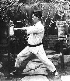Optional training:(Not Recommended)You can supplement with a bucket of sand. Straight punch the sand 30 times and repeat with the backfist. Do 100 spearhand thrusts into the sand. You can also rub the sand between you hands to toughen the skin. Some iron palm practitioners feel that it is unwise to train the knuckles of the fist because of the long term joint damage. This is fine for strict iron palm fighters, however if you must, and you want to train in any fist striking art, it may be wise to strengthen your knuckles. Chinese acupressure teaches that training the fingertips can weaken the eyes. Different teachers advocate different numbers of strikes per session. Some use hundreds or even thousands of repetitions. Some say to train three times a day, others say you must train the exact same time everyday without missing a day. Maybe these routines are ideal. You can train whenever and even miss a day or two. The less days you miss, the better it will be for you. You should achieve impressive results after 100 days of training. At that point, you should be able to break a single patio block with a flat palm slap (use a towel padding at first). If it helps, mark the days off on your calendar. If you don't keep a record, you may not be training as often as you think. Good Luck! Makiwara Training![]() Karate conditioning, focuses primarily on the use of the makiwara. Makiwara come in various sizes and shapes, but basically consist of a slightly flexible wood post wrapped with rope. The makiwara is struck repeatedly with increasing intensity, resulting in toughened, calloused hands and enlarged (calcified) knuckles. Seiken (fore-fist) and tegatana (knife-hand) are the two primary techniques, but any surface such as palm heel, elbow, knees, and kicks may be used. You can also do knuckle push-ups, although hundreds are required. These will strengthen the wrist as well. They will also build calloused knuckles although slower, will do so without damaging your hand. Makiwara should be trained daily, but there is no strict set regimen. The key is not hitting the makiwara so hard that you hurt yourself or tear the skin on the knuckles, but repetition and consistency are very important. If you hurt yourself you set your training back a lot. How to TrainWhen striking the makiwara during your training, it is important to stay relaxed. Allow your hand to drop onto the surface.Do not tense the arm or shoulder, or exert extra strength while striking. Always breath out as you strike. Exerting strength or failing to breath out is said to stress the heart. Train at your own risk.