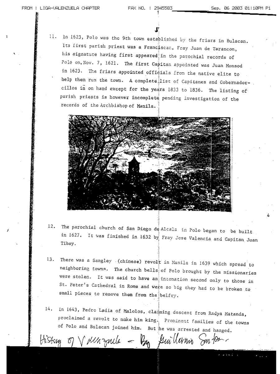 In 1623, Polo was the 9th town established by the friars in Bulacan. Its first parish priest was a Franciscan, Fr. Juan de Tarancon, his signature having first appeared in the parochial records of Polo on Novermber 7, 1621. The first Capitan appointed was Juan Monsod in 1623. The friars appointed the officials from the native elite to help them run the town. A complete list of Capitanes and Gobernadorcillos is on hand except for the years 1833 to 1836. The listing of parish priests is however incomplete pending investigation of the records of the Archbishop of Manila.