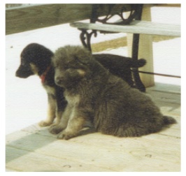 Two-toned dogs as adults may vary from the saddle marked dog with very little black on the dog other than the saddle and muzzle,all the way to very dark dogs that appear nearly black. Two-toned dogs also usually have silvering through their coat at the neck,across the withers,and down the topline.The degree of this silvering{also sometimes called salt&pepper,or peppering}may vary widely from dog to dog.This silvering has nothing to do with the silver ground color gene,and does not mean that the dog can produce Black/Silver.The darkest two-toned dogs usually carry the recessive for solid black. I do not like to use the term "Black/Tan"to denote the two-toned dogs-as these dogs may be any combination of the primary and secondary colors-and genetically the colors are the same for these and agoutis,it is the pattern that differs between these and agoutis.