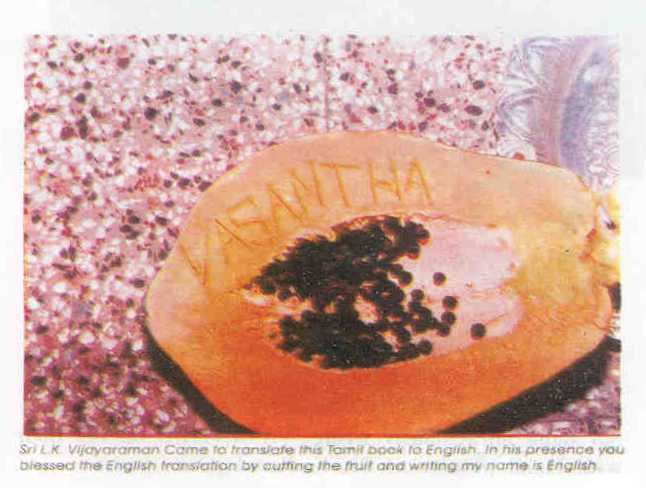 On 25 January, 1997 when I had started for Paramakudi to write this book, I got Krishna's darshan in my morning meditation. Krishna said, "That day I did nothing to Radha. Even then she was immersed in her own soul’s bliss. That is why, I make your prema public so that they will come to know of My prema. You are the very flame of prema life."