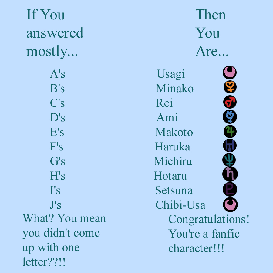 Ever wonder which pretty soldier you'd be if you were an anime character? That's what this quiz is for!